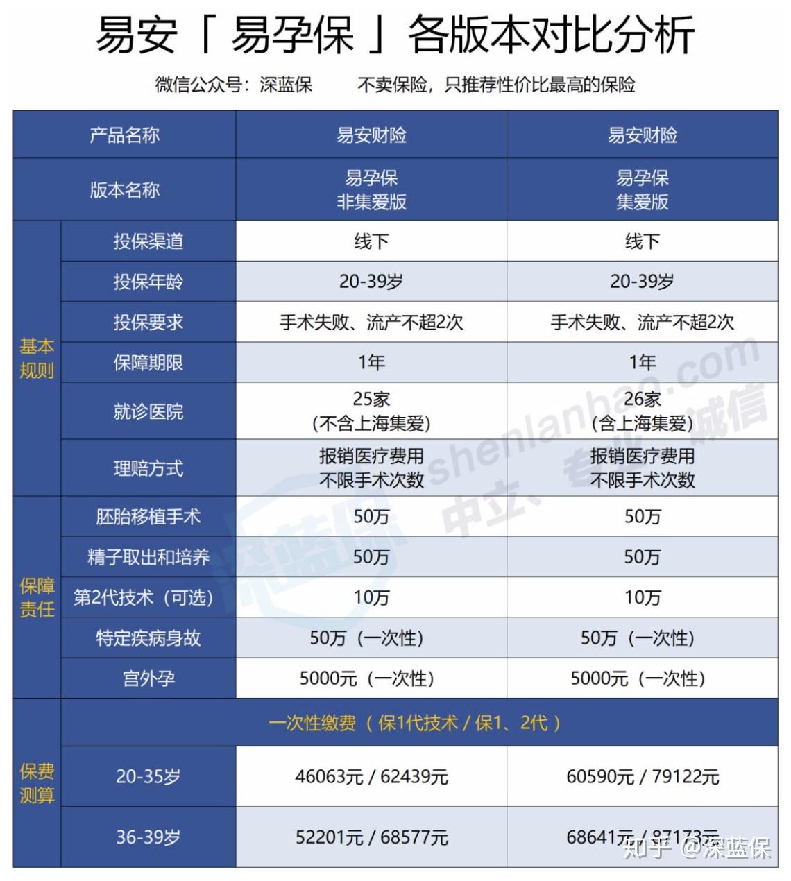 直接說結論:如果預算不高:眾安試管嬰兒保險的基礎版,30 歲保費 3700 元,如果手術連續失敗 3 次,就一次性賠 1.8萬。雖然理賠門檻較高,但多少能彌補一些費用。如果看重全面保障:復星好孕星是保障兩年的,手術失敗兩次就開始賠付,還保減胎、流產、并發癥等;如果想去亞洲、美國等地做手術,也有相應的計劃可選。如果預算充足:易安易孕保的保額有 50 萬,一年內不限次數報銷,但是保費也要貴不少。不過這款產品不保第 3 代試管嬰兒技術。