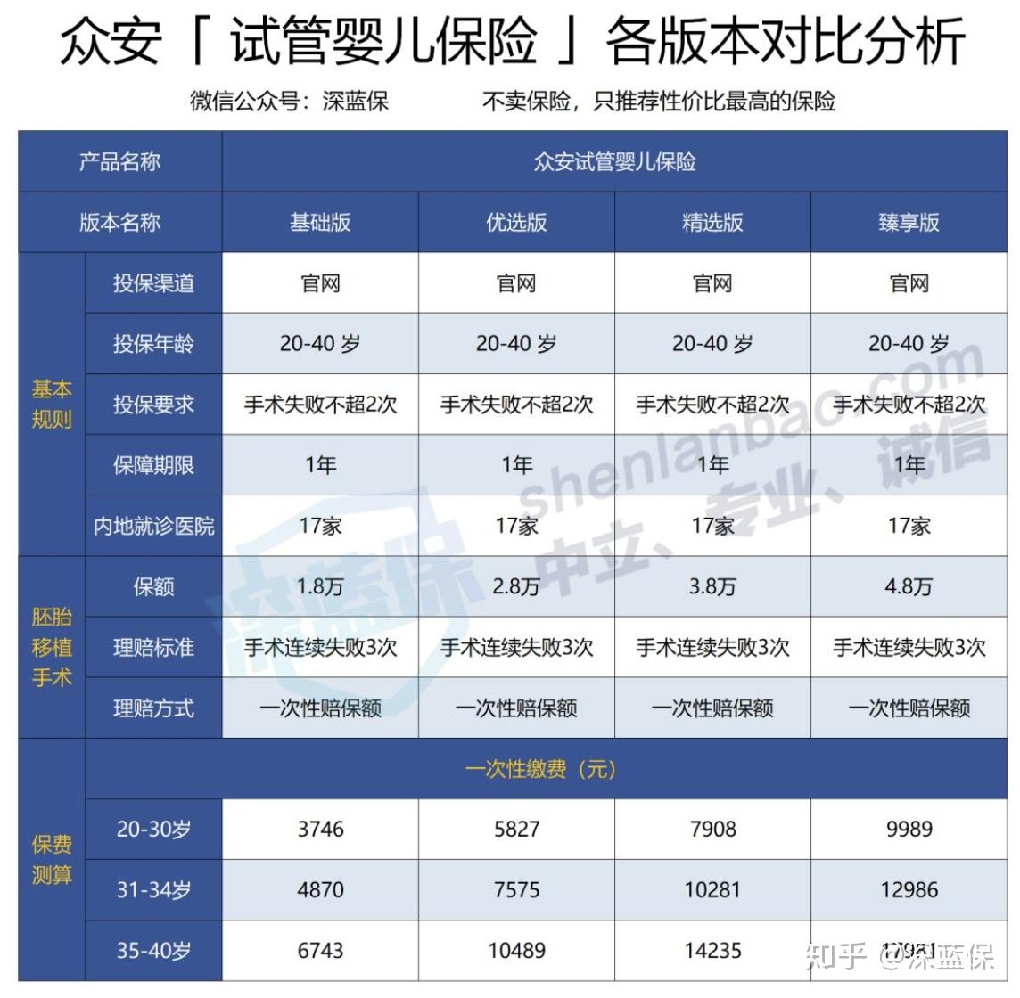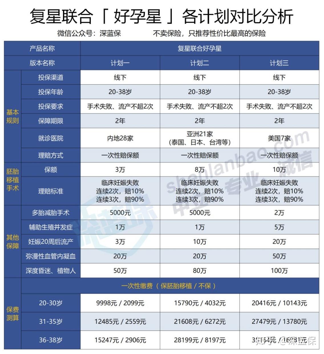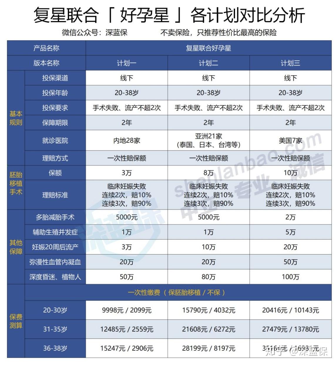 直接說結論:如果預算不高:眾安試管嬰兒保險的基礎版,30 歲保費 3700 元,如果手術連續失敗 3 次,就一次性賠 1.8萬。雖然理賠門檻較高,但多少能彌補一些費用。如果看重全面保障:復星好孕星是保障兩年的,手術失敗兩次就開始賠付,還保減胎、流產、并發癥等;如果想去亞洲、美國等地做手術,也有相應的計劃可選。如果預算充足:易安易孕保的保額有 50 萬,一年內不限次數報銷,但是保費也要貴不少。不過這款產品不保第 3 代試管嬰兒技術。
